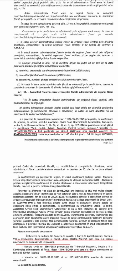 Azi însă am primit o adresă din care rezultă că Asociația Civică Stop Discriminării Cetățenilor a fost executată silit tocmai pe amenda de 500+500 lei anulată, plătită de doamna doctor (unde și executarea silită a organului fiscal a fost anulată) în dosarul nr. 4088/2/2023 și o amendă de 300 lei în dosarul nr. 13146/3/2024 (ce ne-a fost pusă în sarcină în solidar, Asociației și respectiv dnei. doctor , amendă achiată de doamna doctor și împotriva căreia s-a formulat contestație la executare).