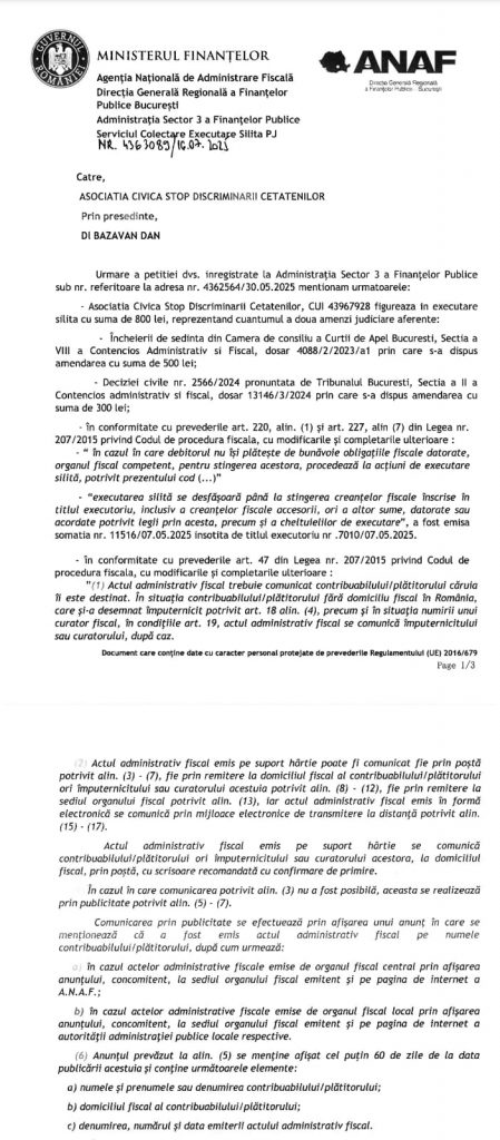 Am scris acum ceva timp că o judecătoare de la Curtea de Apel București (ce s-a pensionat la vârsta de 48 de ani cu vreo 25.000 de lei) ne-a amendat Asociația Civică Stop Discriminării Cetățenilor și pe dna dr. Hagimă cu 500 lei fiecare, și deși am anulat amenda, ticăloșii de la organul fiscal Argeș au pus poprire pe mai multe conturi ale doamnei doctor, și chiar dacă am anulat și acea executare silită, Adminsitrația Sector 3 a Finanțelor Publice București face executare silită Asociației.