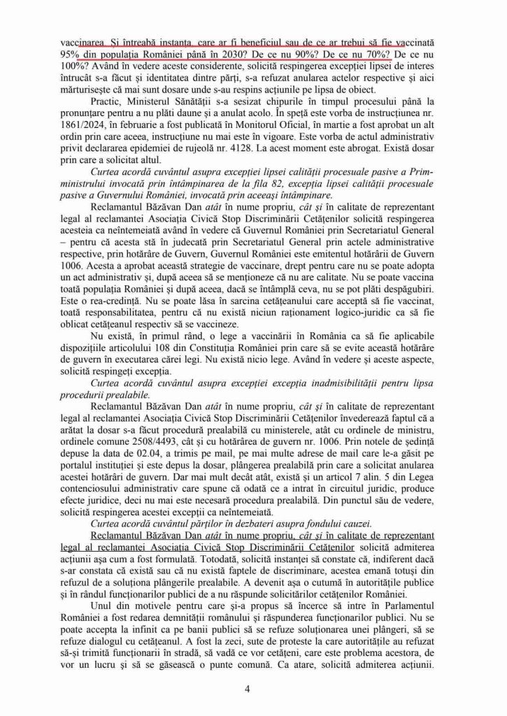 Instanța de fond reține Nelegal și Netemeinic și în pagina 20 a hotărârii criticate că vaccinarea nu este obligatorie în viziunea HG 1006, dar atunci care este rostul unei strategii, și de ce înseamnă că până în 2030 trebuie vaccinată peste 95 %, acestea fiind alte motive de casare prevăzute de art. 488 alin. (1) pct. 6 și pct. 8 NCPC, de vreme ce nu avem o lege a vaccinării, având și o încălcare a NCC: ”De asemenea, reclamanţii se întreabă cum poate deveni vaccinarea obligatorie printr-o hotărâre de guvern, atâta vreme cât obligativitatea ei nu a fost reglementată printr-o lege. Or, aşa cum instanţa a constatat deja, HG nr.1006/2023 nu instituie obligativitatea vaccinării, care rămâne un act voluntar, fapt rezultat expresis verbis din pct.IV al anexei la act, potrivit căruia „în România vaccinarea este recomandată ca acţiune preventivă de sănătate publică şi reprezintă un act voluntar al persoanei sau părintelui, în cazul copiilor,” motiv pentru care criticile reclamanţilor privind încălcarea art.108 din Constituţie sau art.60, 61 Noul cod civil nu pot fi reţinute. Având în vedere consideraţiile mai sus expuse, nu pot fi primite nici susţinerile privind încălcarea autorităţii părinteşti prev.de art.483 şi urm.Noul cod civil sau art.64 Noul cod civil, ori art.382, 653 din Legea nr.95/2006.”