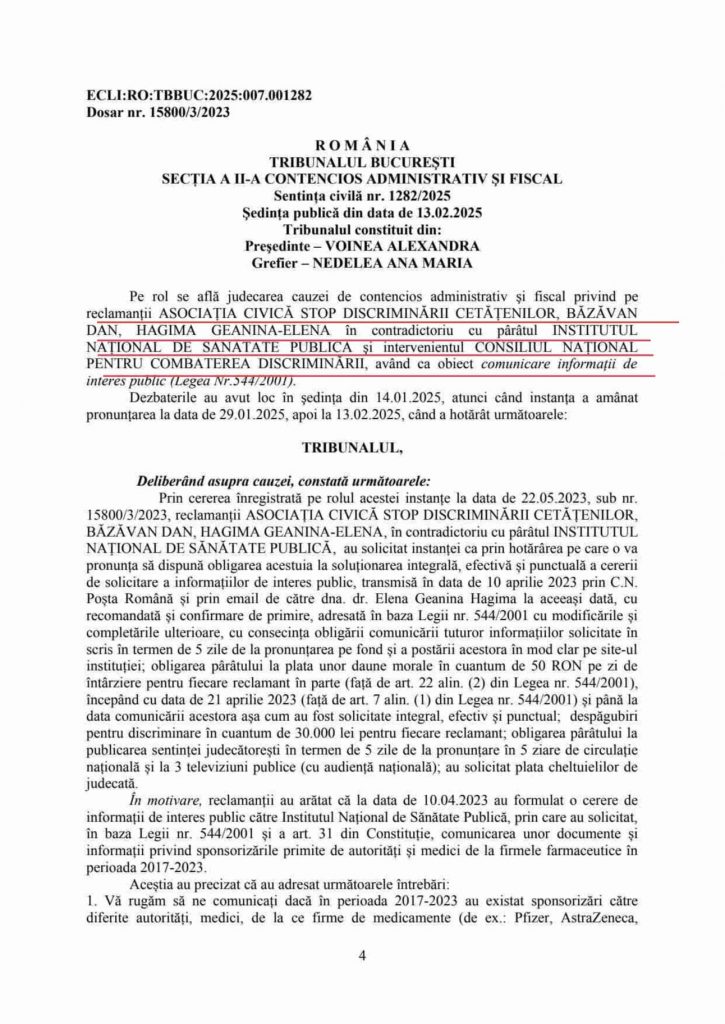 Acțiunea a fost introdusă la data de 22.05.2023 (solicitarea de informații de interes public fiind adresată din 10.04.2023 atât pe email cât și prin CN Poșta Română cu recomandată și confirmare de primire), respinsă la data de 13.02.2025, iar motivarea a fost comunicată la mai bine de un an de la pronunțare cu încălcarea dreptului la un proces echitabil (art. 6 NCPC și art. 21 din Constituție, respectiv textul art. 31 din Constituție (fiind total golite de esență juridică de către judecătorul Tribunalului), art. 6 pct. 1 din CEDO) și a termenului de redactare și motivare prevăzut de art. 426 NCPC (comunicată la data de 19.02.2026, respectiv la data de 20.02.2026 prin CN Poșta Română).