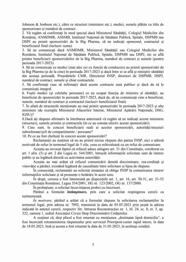 Constatăm, de asemenea că instanța de fond a încălcat limitele de investire prin cererea introductivă, criticând Nelegal și Netemeinic (având și o încălcare a principiului contradictorialității, al oralității, al disponibilității și al rolului activ al judecătorului) în pagina 8 a hotărârii 1282/2025: ”Se mai reţine, totodată, că ulterior comunicării acestui răspuns, reclamanţii nu au indicat nicio critică punctuală sub aspectul conţinutului efectiv al răspunsului ce le-a fost comunicat, iar acţiunea introductivă a fost motivată raportat la lipsa efectivă a unui răspuns, cu excepția răspunsului oferit la întrebarea nr. 1 (prin răspunsul la întâmpinare), respectiv ”Vă rugăm să ne comunicați dacă în perioada 2017-2023 au existat sponsorizări către diferite autorități, medici, de la ce firme de medicamente (de ex.: Pfizer, AstraZeneca, Johnson & Jonhson etc.), către ce structuri (ministere etc.), medici, sumele plătite cu titlu de sponsorizare și numărul de contract”, răspunsul pârâtului fiind în sensul că întrebarea nu este de competența INSP.”, dar NICI NU A PUS ÎN DISCUȚIE ACESTE ASPECTE, CEEA CE CONSTITUIE MOTIVE DE CASARE PREVĂZUTE DE ART. 488 ALIN. (1) PCT. 5-6 NCPC.