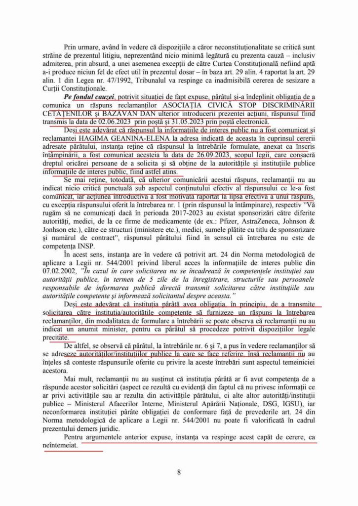 Putem observa nu numai faptul că Institutul de Sănătate Publică refuză practic să comunice informații de interes public (recidivând deși este plătit din bani publici), dar și faptul că Tribunalul Brevetează acest refuz și se transformă în avocat al autorității pârâte, ceea ce este inadmisibil într-un stat de drept.