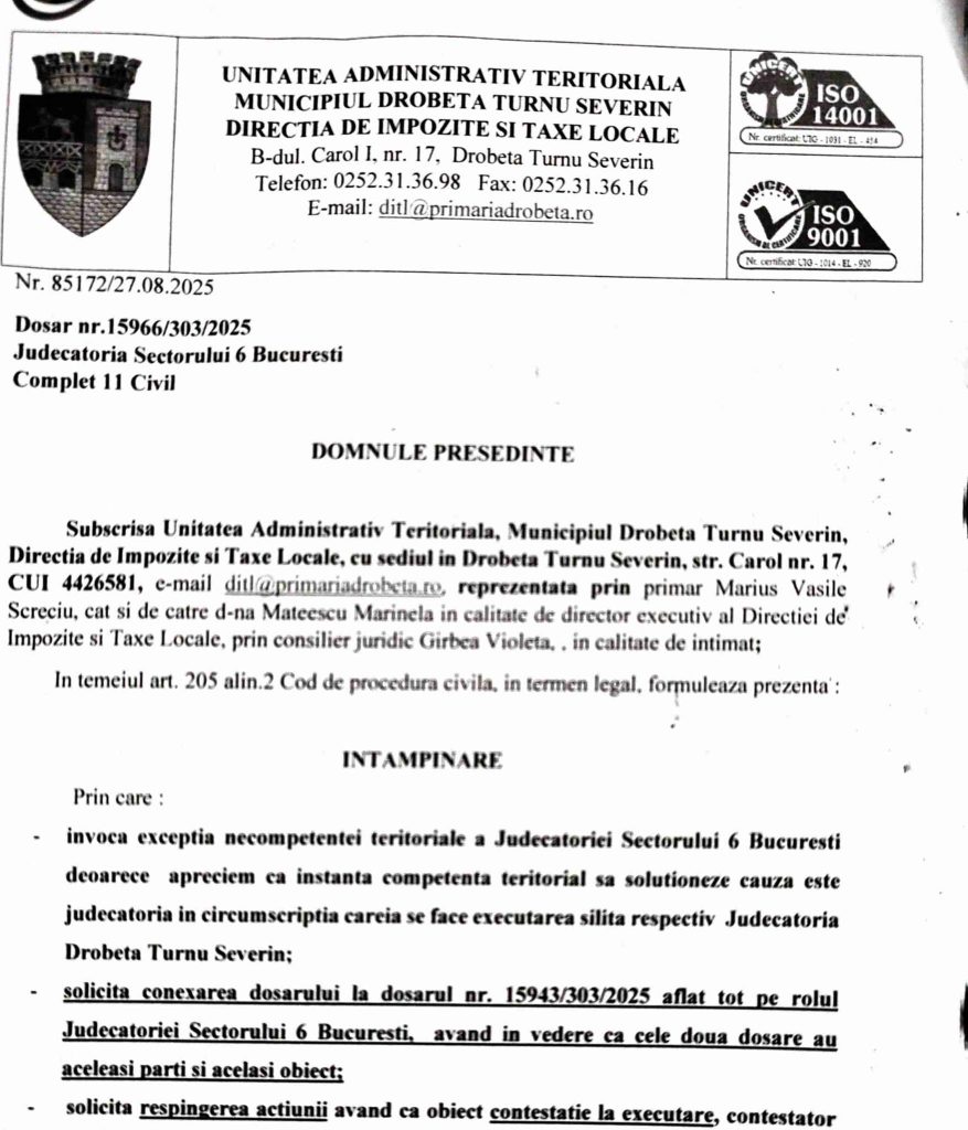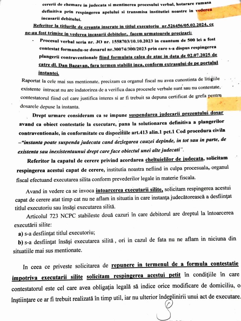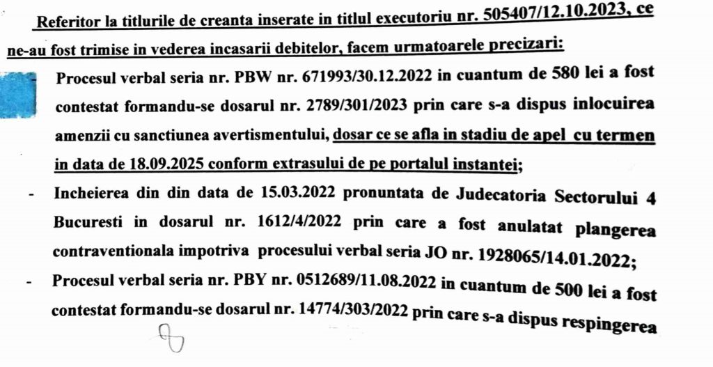În apărările (puerile) în dosarul nr. 15966/303/2025 aceștia recunosc că aveau cunoștință de amenzile contestate dar cu toate acestea cu Tupeu și Nesimțire cer instanței suspendarea (și să respingă acțiunea) chiar dacă au făcut executări silite Nelegale / Ilegale și au pus poprire pe un cont și pe venituri.